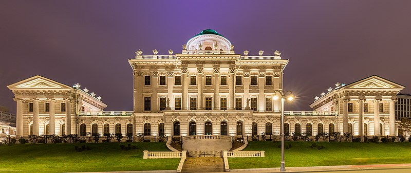 ↑ 帕什科夫宫,位于莫斯科中央区(详细而言就在列宁藏书楼旁边,和克里姆林仅仅一街相隔),建于1784—1786年。建筑师是瓦西里·巴热诺夫,有留学法国履历,是俄罗斯古典主义期间本国建筑巨匠的代表人物,他主持过的更大项目之一就是奉叶二之命设想与建造相当于“莫斯科的彼得霍夫宫”的察里津诺。