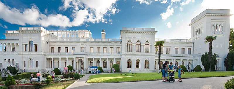 ↑ 克里米亚半岛雅尔塔的里瓦几亚宫,始建于1834年(应该是),自1861年起成为了末代皇帝尼二的行宫。那座宫殿的汗青地位非常特殊,1945年,斯大林、罗斯福和丘吉尔恰是在那里召开了之后被称做“雅尔塔会议”的友邦领袖会议,成立了决定二战之后世界次序的雅尔塔系统。