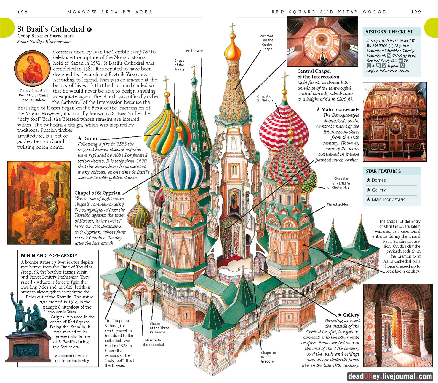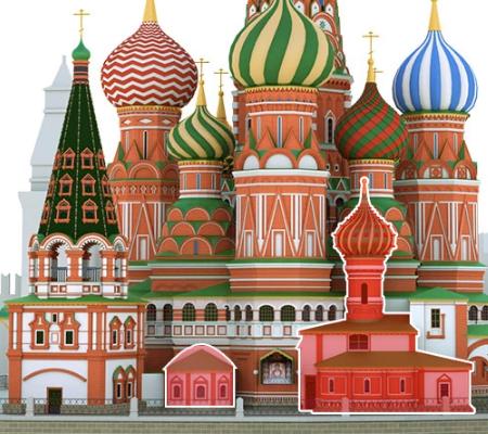 ↑ 圣瓦西里大教堂——世界奇迹,国度手刺,红场之星,旅客指南、巧克力包拆纸和积木玩具盒上永不缺席的象征,不断被模拟,从未被超越。建于1555—1561年,主持建造它的是普斯科夫建筑师波斯特尼克·雅科夫列夫。固然在坊间不断流行一种传言,说伊凡四世为了让世界上再也不会呈现第二座教堂与他的那座相媲美,残酷无情地刺瞎了建筑师的双眼——但99.99%以上的概率那是无稽之谈,因为有文献佐证在圣瓦西里大教堂落成以后,沙皇继续派波斯特尼克去主持重建喀山克里姆林。