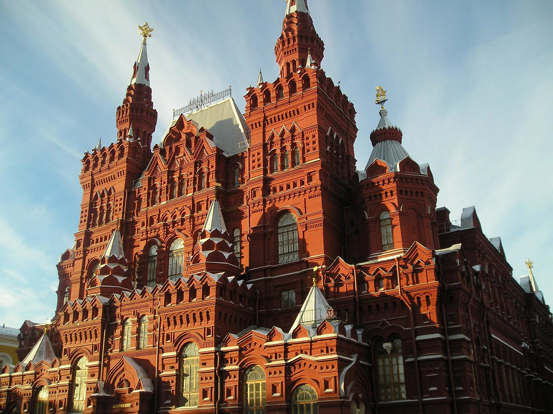↑ 俄罗斯国度汗青博物馆,建于1872—1883年。它与圣瓦西里别离坐镇红场两头,它光靠外在自己就足以让良多仅有华美皮郛的空壳教堂黯然失色。构成它的要素不包罗巴洛克的细腻曲线与古典主义的柱式系统,它也不需要那些。它的美足以让斯拉夫派的信奉者陷入癫狂:凝望着那只不沾染任何外来宗教与外国艺术的红砖精灵,像一股气打进了他们的心里,带来的是一种积怨一网打尽、世仇得报,巴望在雪地上怒吼着撒泼的快感,从今天起再也不要一味寻求与承受他者,而是要攥紧本身的拳头向着他人狞恶输出——又似乎卵石壁炉里,生长于祖国大地、吮吸清冽河流而成材的松木料枝陪伴毕剥声释放出的熊熊燃烧的火热与红光,照亮东欧丛林风雪交加的漫漫长夜。