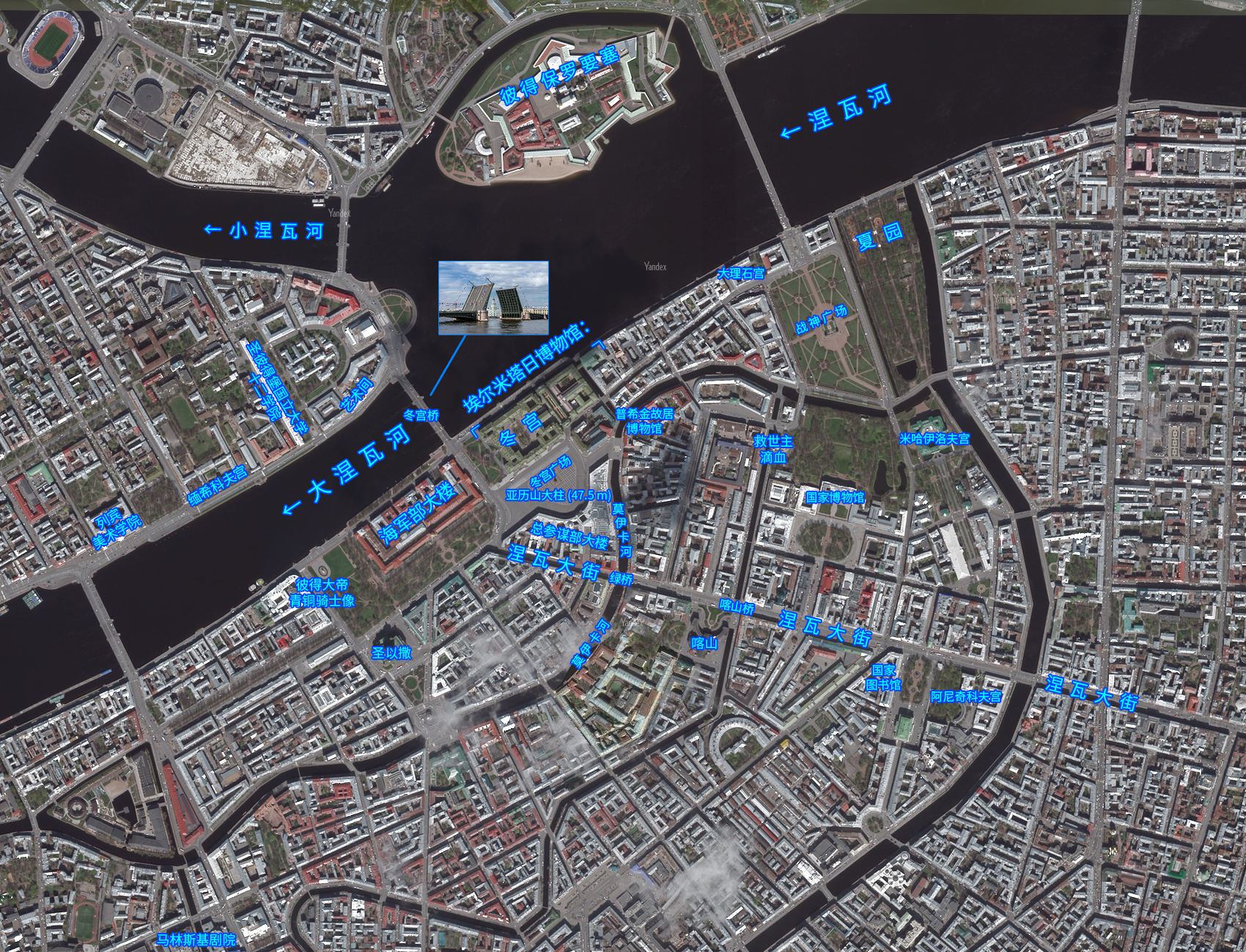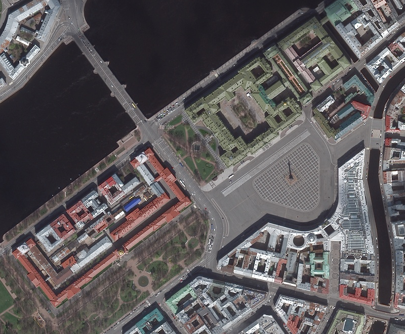 我再贴一下圣彼得堡核心区域的卫星影像吧:西南标的目的的红屋顶建筑群是海军部,西北标的目的绿屋顶的是冬宫,东南标的目的呈现雪白色的三角形就是总参大楼,就请诸位曲不雅地感触感染一下那个严肃的体量吧。趁便一提总参大楼南边的路就是涅瓦大街起始段。