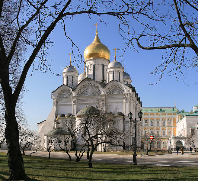 ↑ 圣母领报大教堂(1大8小金圆顶),最早版本可能始建于1291年,现存版本改建于1484—1489年。改建工程由两位来自普斯科夫的建筑师主持。普斯科夫几乎就是其时俄国的西部边境第一城,紧挨着爱沙尼亚和拉脱维亚(其时还叫利沃尼亚),跟从神罗过来(用剑)布道的日耳曼人眉来眼去的就学了几手。