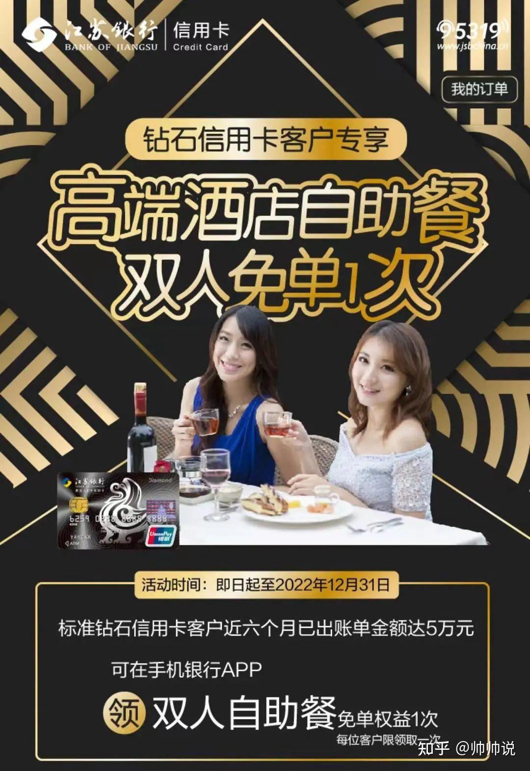本日起至2022年12月31日,近6个月已出账单金额达5万元,领双人自助餐免单权益1次。领取途径:手机银行APP - 网银 - 我的网银权益 - 钻石卡 - 钻石卡自助餐权益。