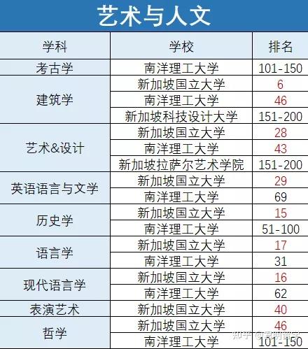 在 艺术与人文范畴,新加坡两所高校的表示如下,新加坡国立大学排名总榜单第十五位;而南洋理工大学排名四十一位。