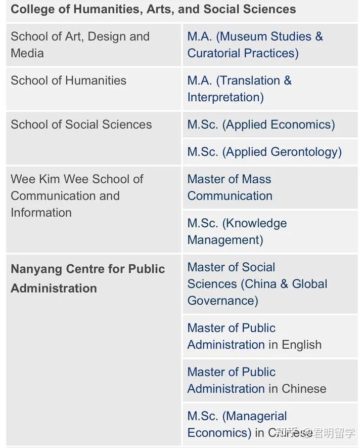 然后点击响应学院,好比Faculty of Arts & Social Sciences,就会呈现该学院开设的授课型硕士项目列表,点击响应项目就会进入项目标官网主页,在官网置业你能够查询项目介绍,申请要求,结业要求,开设课程和奖学金等内容。