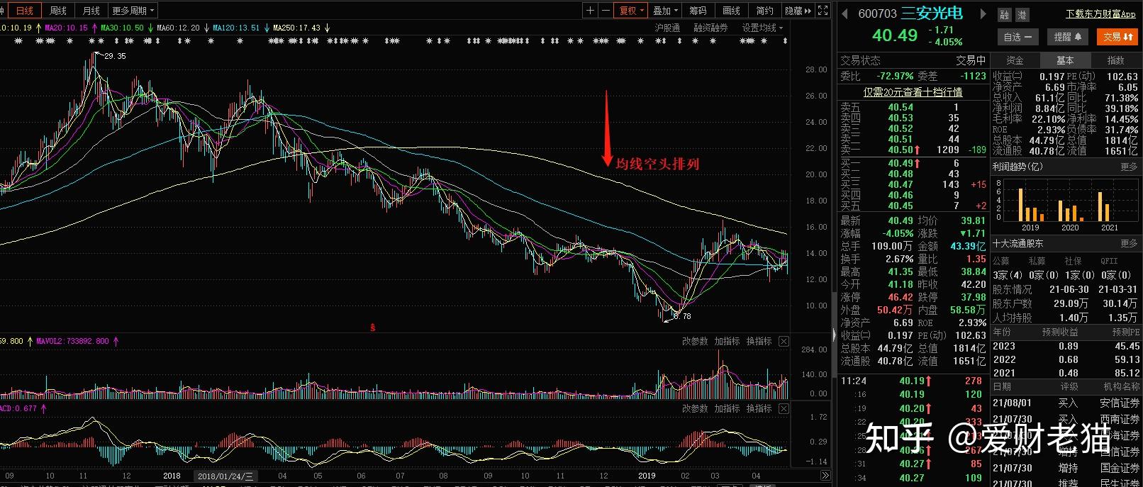 与多头摆列相反,一般MA5,MA10,MA20,MA30,MA60,MA120,MA250等均线从下到上摆列呈下降走势代表空头摆列,申明股价呈下降趋向不容乐不雅。如三安光电在2018年的走势。