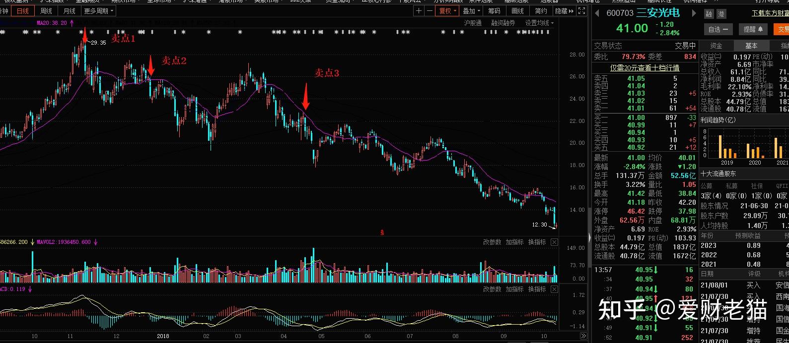 ①股价在均匀线上方运动,并呈现上升趋向,离均匀线越来越远,表白近期内买入者都已获利,随后会有获利回吐,那时是卖出信号,卖点1。