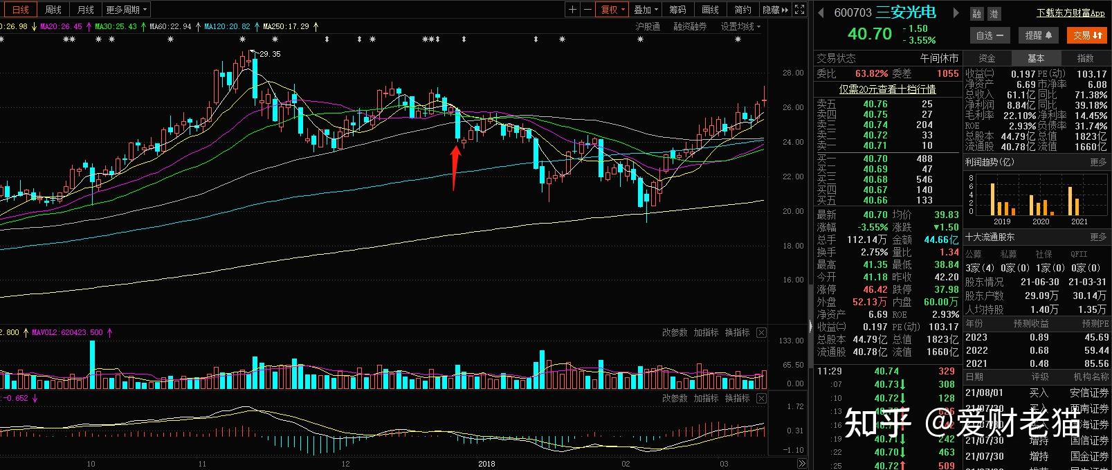 我们能够通过MA5,MA10,MA30等指示的颜色来晓得各类颜色的均线代表的是几日均线,如图中箭头所示。