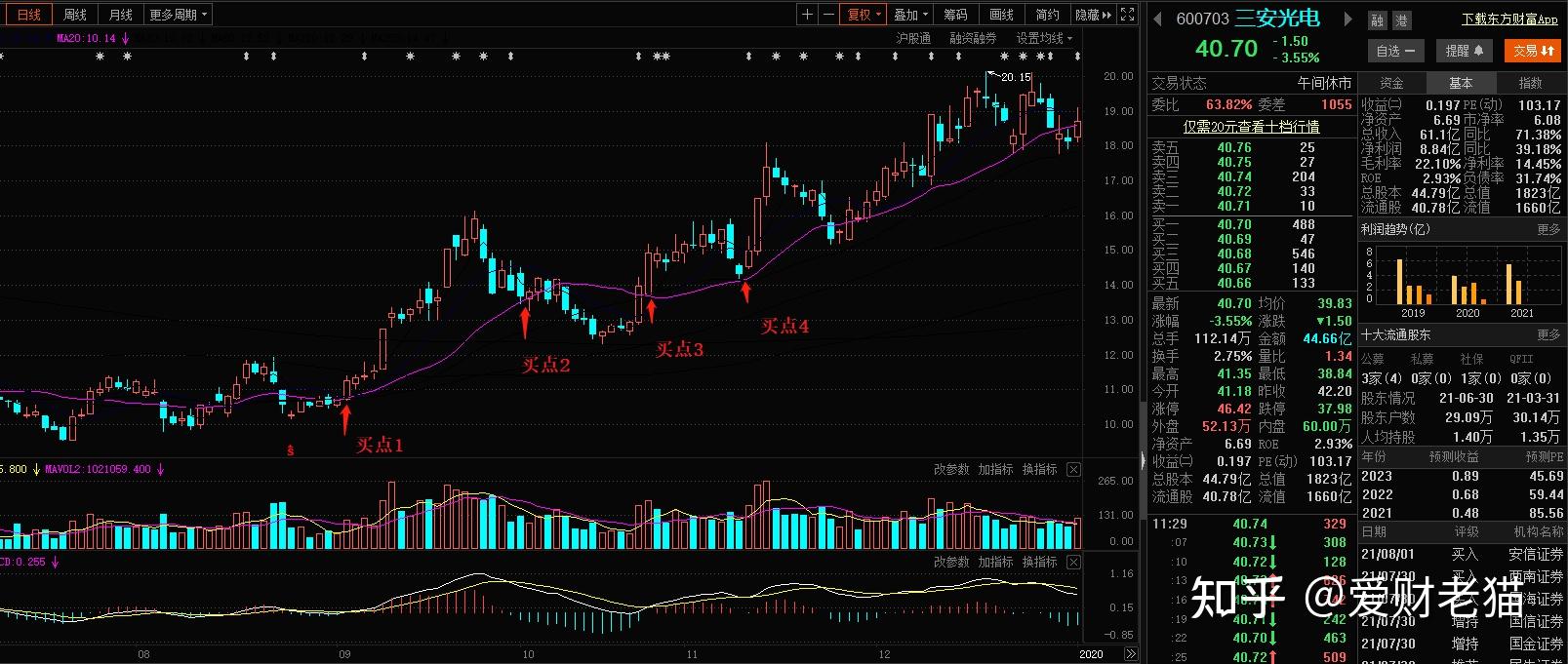 ①挪动均匀线从下降转为程度,而收盘价从均匀价的下方转向上方挪动与均匀线订交,并超越均匀线时,构成一个买进的信号,买点1。