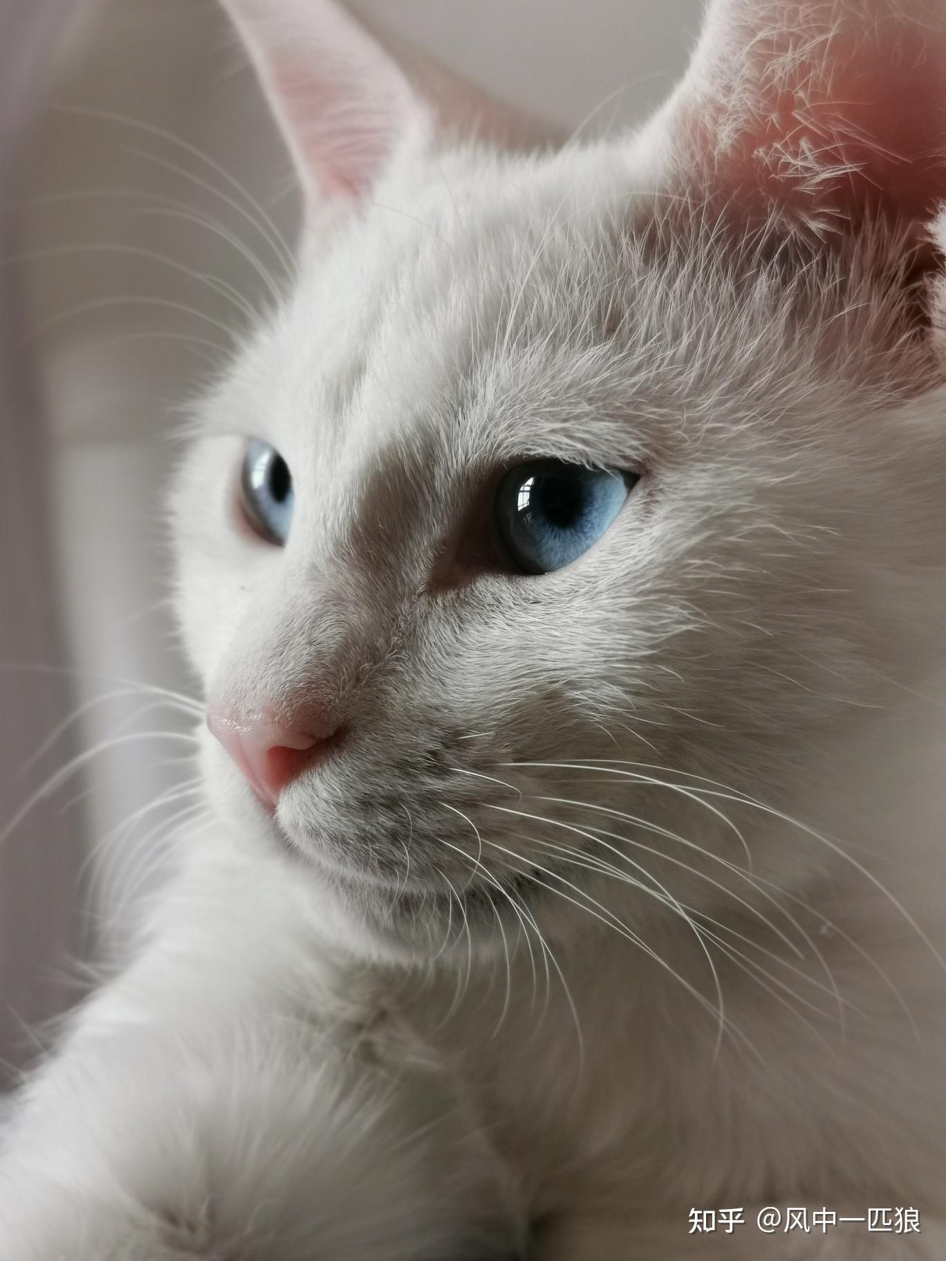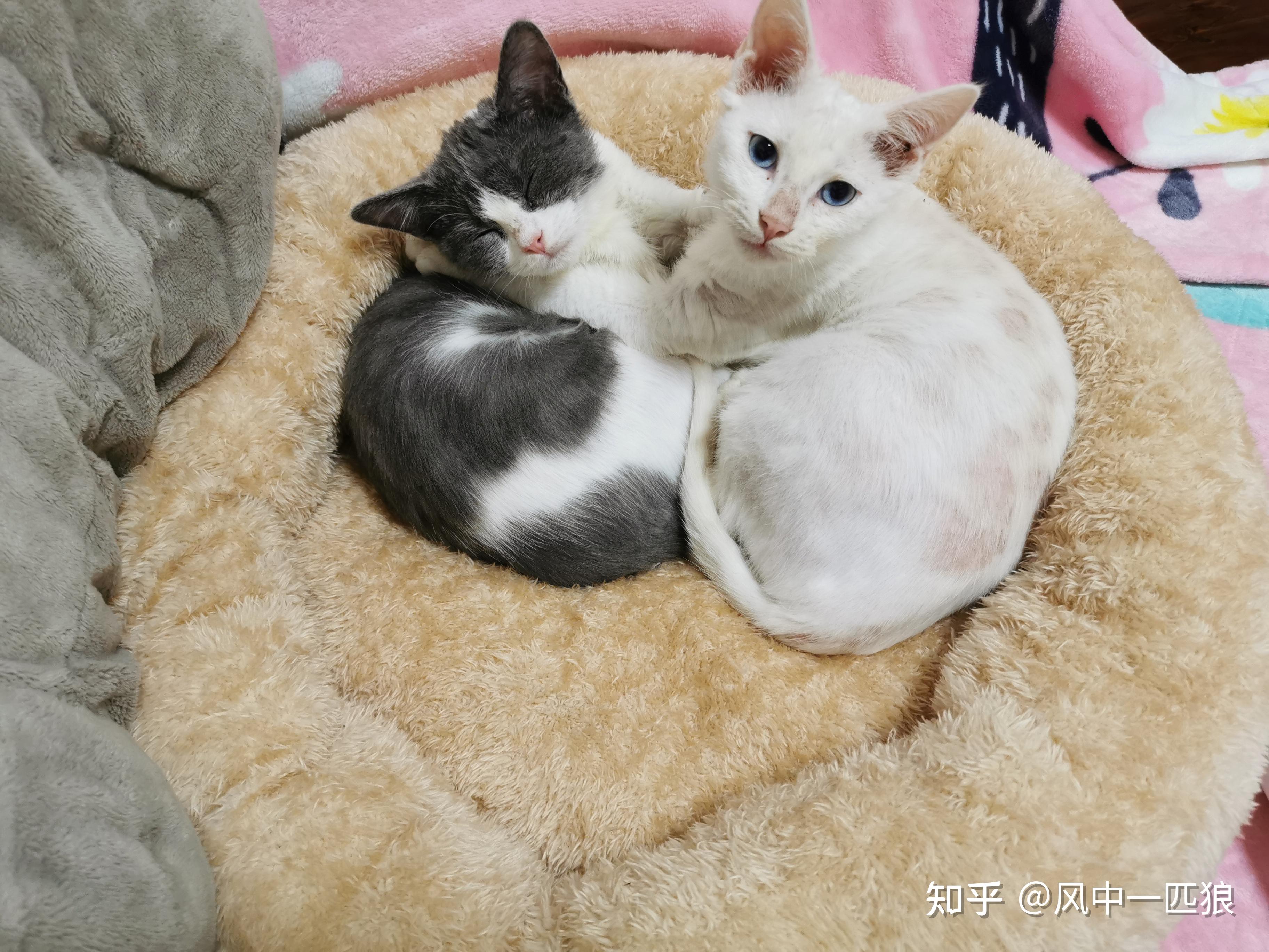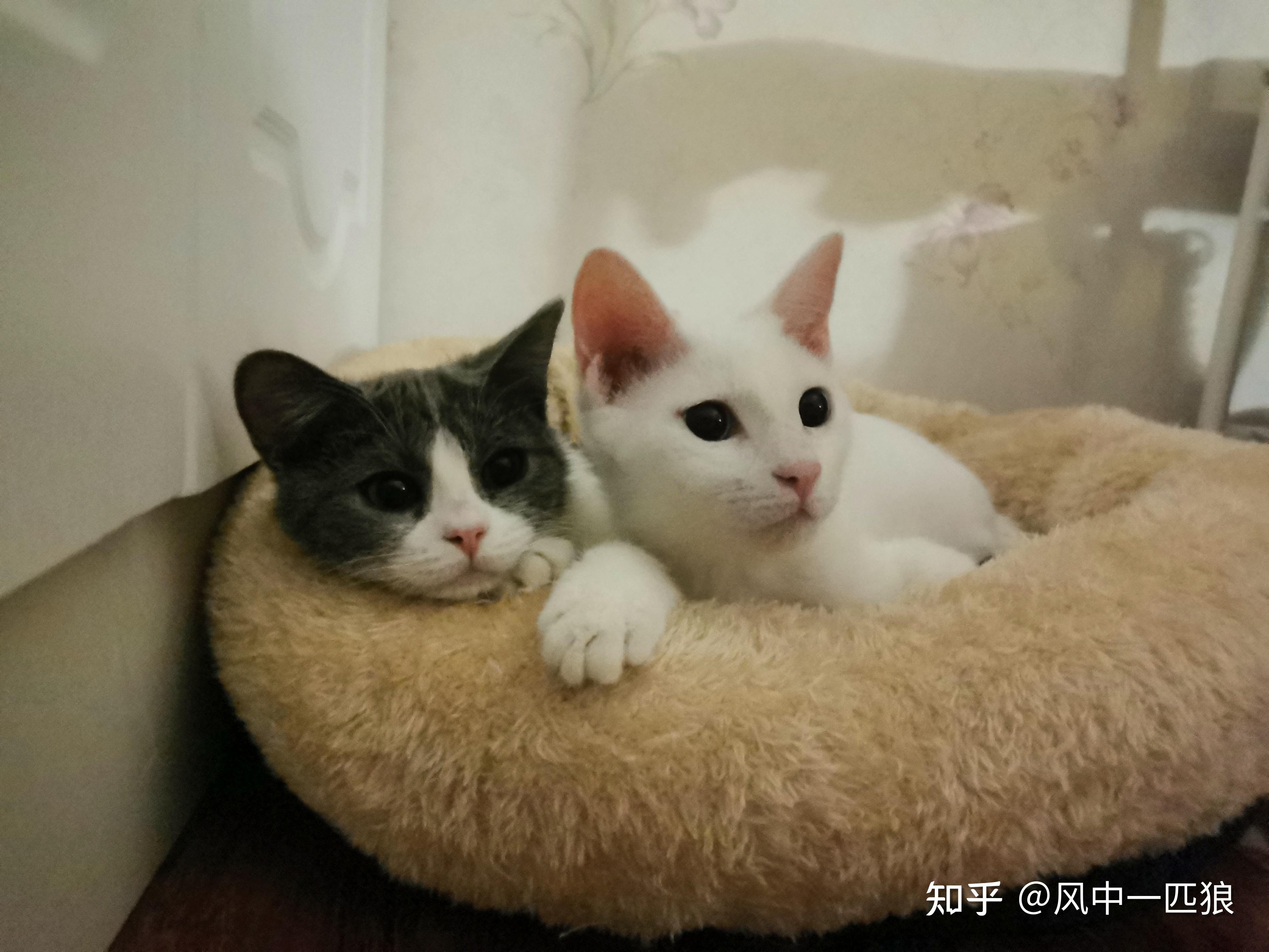 右边天蓝色是水尾子,女孩儿,右边白猫是财财,女孩儿。