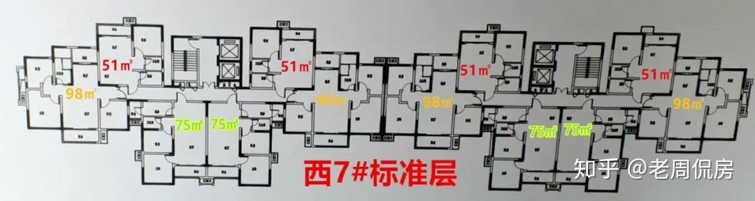 西7#栋,目前只要尺度层的图纸,并没有带尺寸的单个洋房图;从构造看,属于两个单位的两梯四户,洋房面积也更小,从51㎡的enrolled,到98㎡的二房。