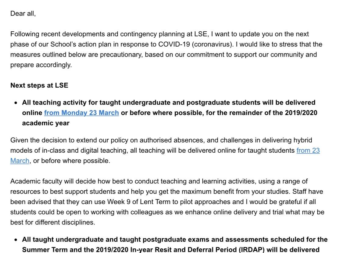 不外在3.13日的时候就收到学校即将线上上课的通知啦!其原因就是我们学校大三办理系的两位学长传染了(非中国人),所以学校出于隆重立场,立即颁布发表了线上教学。讲实,LSE比拟有些学校呈现新冠传染者还对峙线下上课的学校实的好太多了。据说我们学校仍是第一位颁布发表线上教学+线上期末测验的学校呢!(骄傲)!