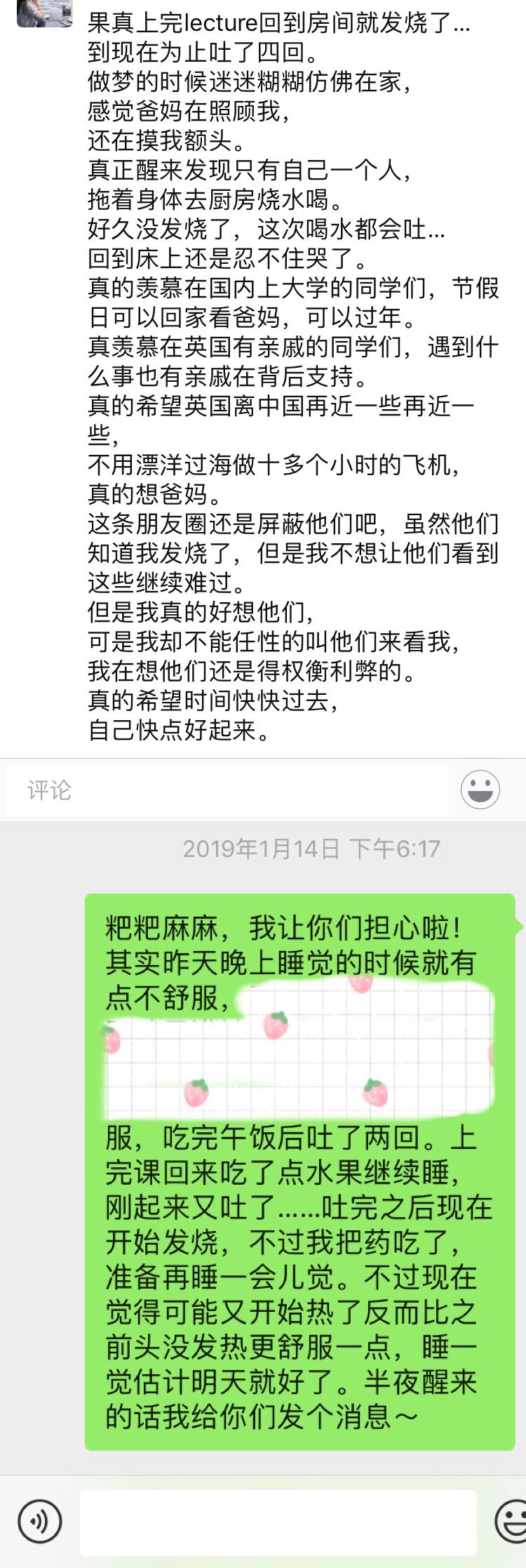 当初圣诞节假期回家的时候,我妈不断叨叨说良多人圣诞节回家后再回学校就不会想家了。大要各人和各人纷歧样吧,成果对我来说,实的是不存在的。周五坐飞机回英国的时候,我和我妈在出境的门口一边抱着一边哭的稀里哗啦的,我爸在旁边不断在劝我俩别哭,他人都在看着。但是其时实的是不由得,究竟结果第一个学期80多天就回国了,但是那一次却要和家长分隔161天,整整多了一倍。安检的时候列队哭,飞机起飞的那一刹起头哭,然后不断哭到飞机平稳飞翔……不外仍是要感激一下现代科技,还好如今能够打德律风,微信聊天加视频。那比十几年前手札往来要好上良多。