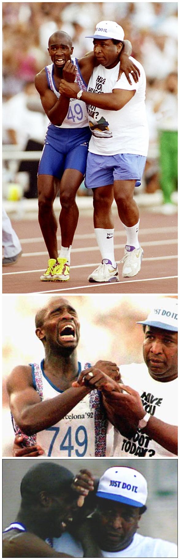 统一时间,正在看台上旁观儿子角逐的吉姆·雷德蒙德再也不由得了,他跑向赛场,冲过保镳,来到德里克面前,痛心地对儿子说出了奥林匹克运动史上最让报酬之动容的对话: