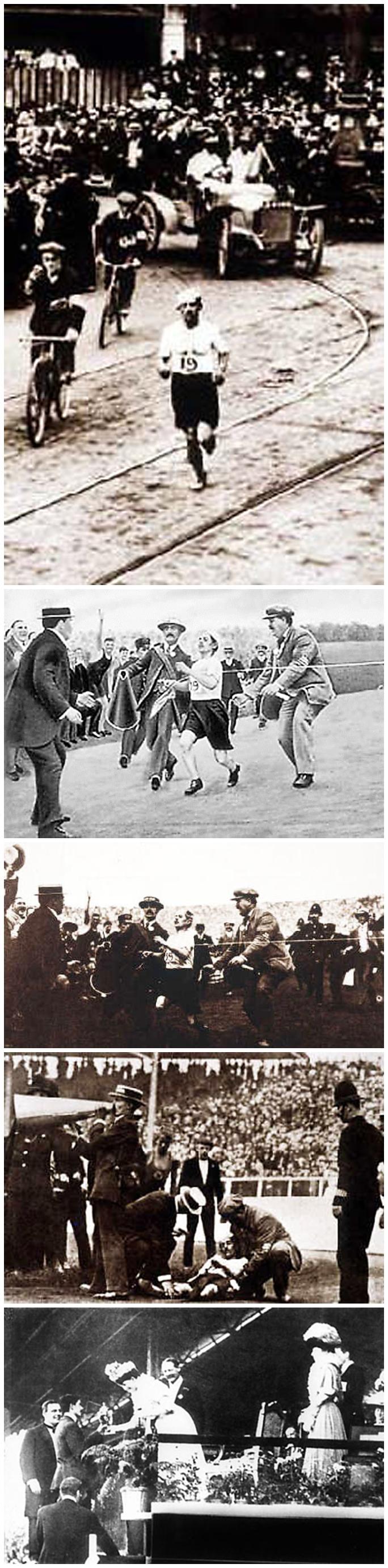 1908年7月24日,名不见经传,个头仅1.5米多的意大利马拉松运发动多兰多·皮特里又一次站在奥运会马拉松赛道上,然而,在那一届奥运会上英美两国在田径赛场上剧烈较劲的气氛中,那名身穿19号运动衫的意大利人起头只是个不起眼的小角色。他的敌手中,美国人约翰·海耶斯(John Hayes)刚刚在纽约杨克斯首届马拉松赛中夺冠;而英国王牌阿历克斯·邓肯(Alex Duncan)也在4月恶劣的天气中胜利斩获全国试用奥运会线路22.5英里赛的冠军,此外呼声颇高的还有来自南非的实力选手查理·海弗伦(Charles Hefferon)和加拿大天才马拉松少年汤姆·朗伯特(Tom Longboat),后者曾是1907年波士顿马拉松赛的冠军。