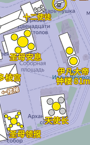 ↑ 圣母领报大教堂(1大8小金圆顶),最早版本可能始建于1291年,现存版本改建于1484—1489年。改建工程由两位来自普斯科夫的建筑师主持。普斯科夫几乎就是其时俄国的西部边境第一城,紧挨着爱沙尼亚和拉脱维亚(其时还叫利沃尼亚),跟从神罗过来(用剑)布道的日耳曼人眉来眼去的就学了几手。